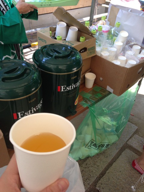 鳥居をくぐると、受付で緑のはっぴを着た氏子の皆さんが、冷たいお茶で歓迎してくれました。