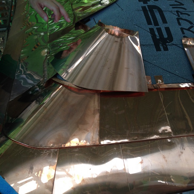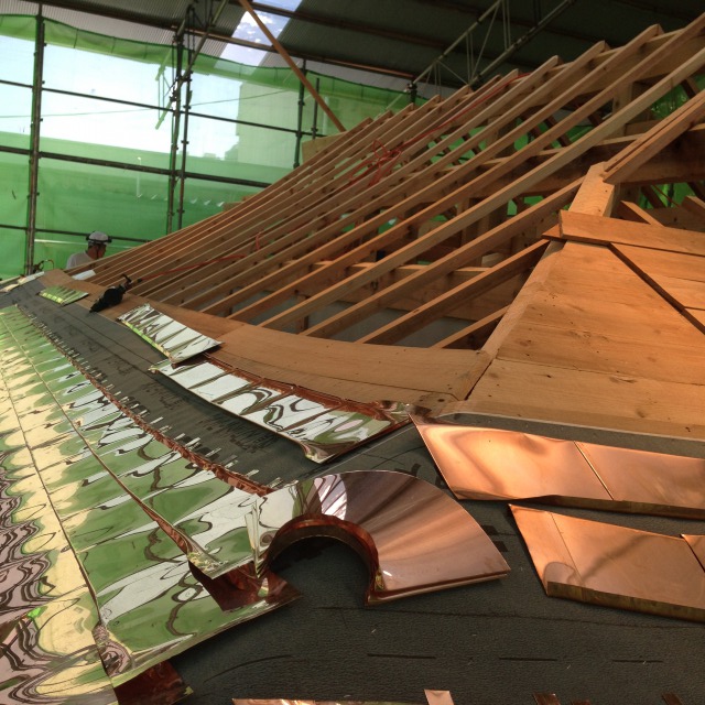 高度な技術で職人さんの手によって、銅が屋根の骨組みに貼りつけられていきます。