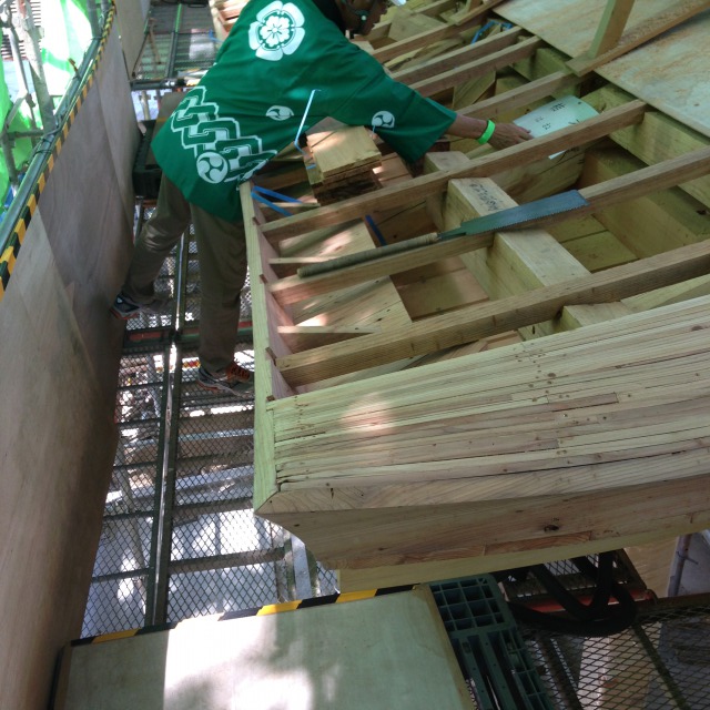 屋根の骨組みに胴が葺かれていきます。